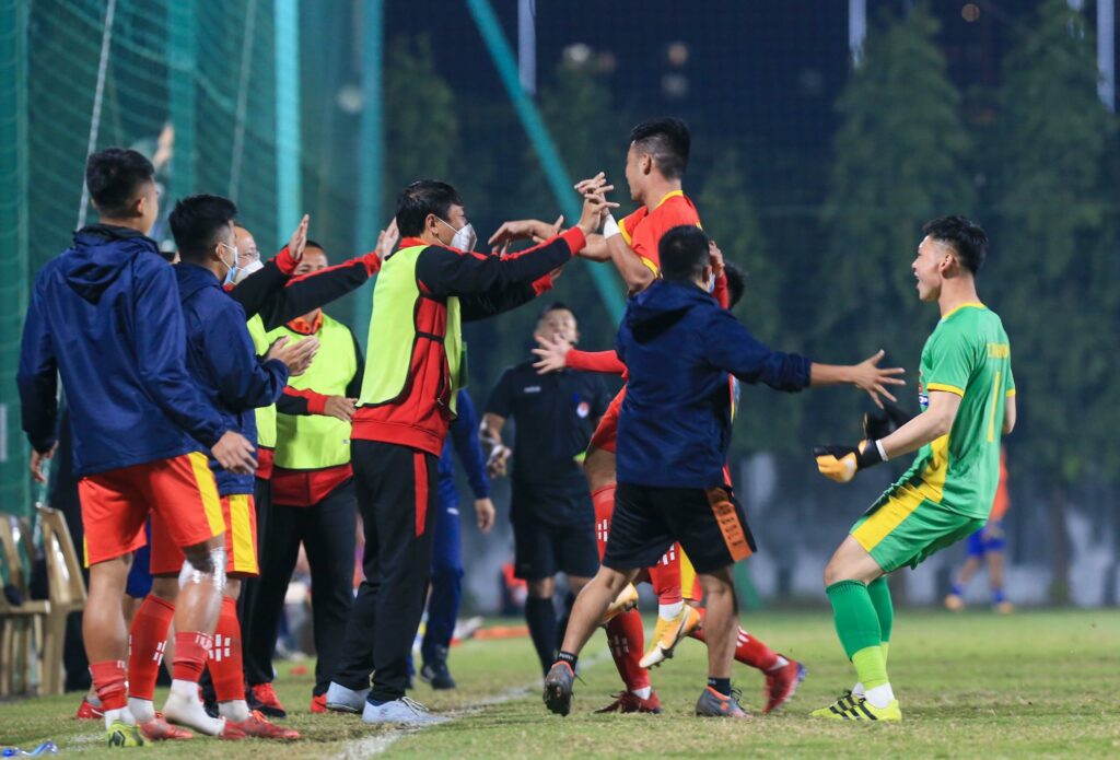 Niềm vui của các cầu thủ U21 HAGL sau khi có bàn mở tỉ số. Chỉ hai phút sau, Đình Lâm ghi bàn nhân đôi cách biệt cho U21 HAGL.